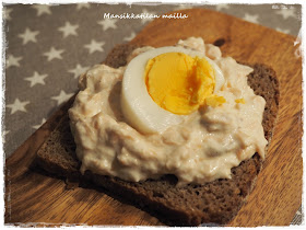 Osaan leivistä käytin piparkakkumuottia, ja osaan en.  Tuollaisen "tuplatähden" väliin (leipää molemmin puolin ja täyte välissä) voisi lisätä myös kananmunasiivun tuomaan lisää ruokaisuutta, kuten laitoin tuohon leipäsiivulle.