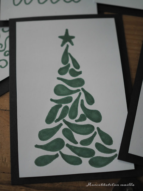 Tämänkin vuoden joulukortteihin löysin idean Pinterestistä. Alkuperäisessä kuvassa kuuset olivat painotuotteita, koska idea oli oli hauska ja yksinkertainen, ajattelin piirtää erilaisia helppoja kuvioita joulukuusen muotoon. Osa korttien kuvioista oli erittäin nopeita ja yksinkertaisia, toisissa meni hieman kauemmin aikaa, mutta en ehtinyt kyllästymään puuhaan, kun kaikki kortit eivät olleet samanlaisia. Osan piirtämisestä muistui mieleen alaluokilla tehdyt kaunokirjoitusharjoitukset. Tussilla haastavaa oli saada tasainen jälki, piti piirtää yhtäjaksoisesti tai miettiä tarkkaan käden leppuuttamispaikat.