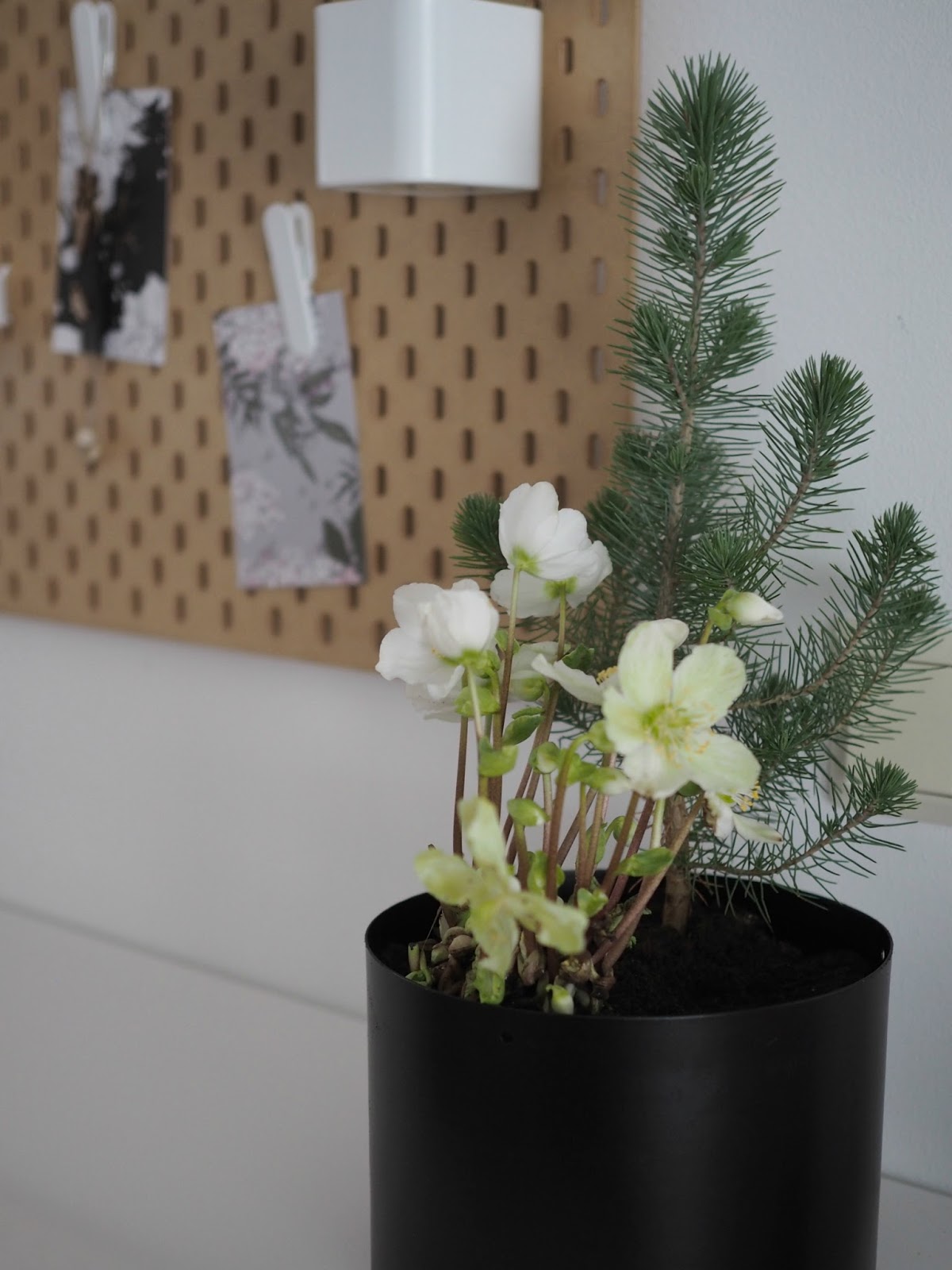 Karu mänty ja herkkä jouluruusu muodostavat minusta kivan parin. Sammal olisi ollut kiva tuohon mullan päälle, tai jokin kolmas kasvi, sypressi ehkä! Juuri nyt on sellainen kerros lunta pihassa, että en ole lähtenyt pihalta, lumen alta, sammalta kaivelemaan. Näyttää siltä, että täällä meillä vietettäisiin pitkästä aikaa valkosta joulua...
