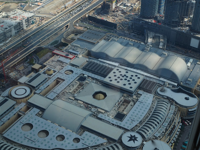 Mies varasi meille liput (täältä) heti tiistaiksi Burj Khalifaan. Näitä lippuja olisi saanut myös Aurinkomatkoilta, mutta kallimmalla tietenkin. Burj Khalifa on (toistaiseksi) maailman korkein rakennus. Korkeutta rakennuksella on lähes 830 metriä. Korkeanpaikankammoisena jännitin tuonne menoa, ihan turhaan onneksi! Kerroksia rakennuksessa on huimat 163, mutta näköalatasanteet sijaitsevat vaatimattomasti kerroksissa 148, 125 ja 124. Tuo ylin näköalatasanne on huomattavasti kalliimpi kuin kaksi alempaa, samoin auringonlaskun aikaan lippu on kalliimpi kuin muuna aikana. Siispä maksoimme hieman vajaa 120 euroa ja tyydyimme kahteen alempaan kerrokseen ja aamupäivään ajoittuvaan vierailuun. Hissiäkin jännitin, mutta nousu oli todella nopea ja tasainen, eikä tuntunut pahasti korvissakaan ja kesti vain minuutin. Meidän lomapäiviin sattui pari sumuista päivää, ja joillekin matkalaisista Burj Khalifa osui sellaiseen päivään. Harmillista, kun nuo liputkin ovat noin hinnakkaat! Meillä oli hyvä, aurinkoinen päivä, eikä kauheaa ryysistä. Veikkaan, että auringonlaskun aikaan on melkoinen härdelli...Käymisen arvoinen paikka ehdottomasti!