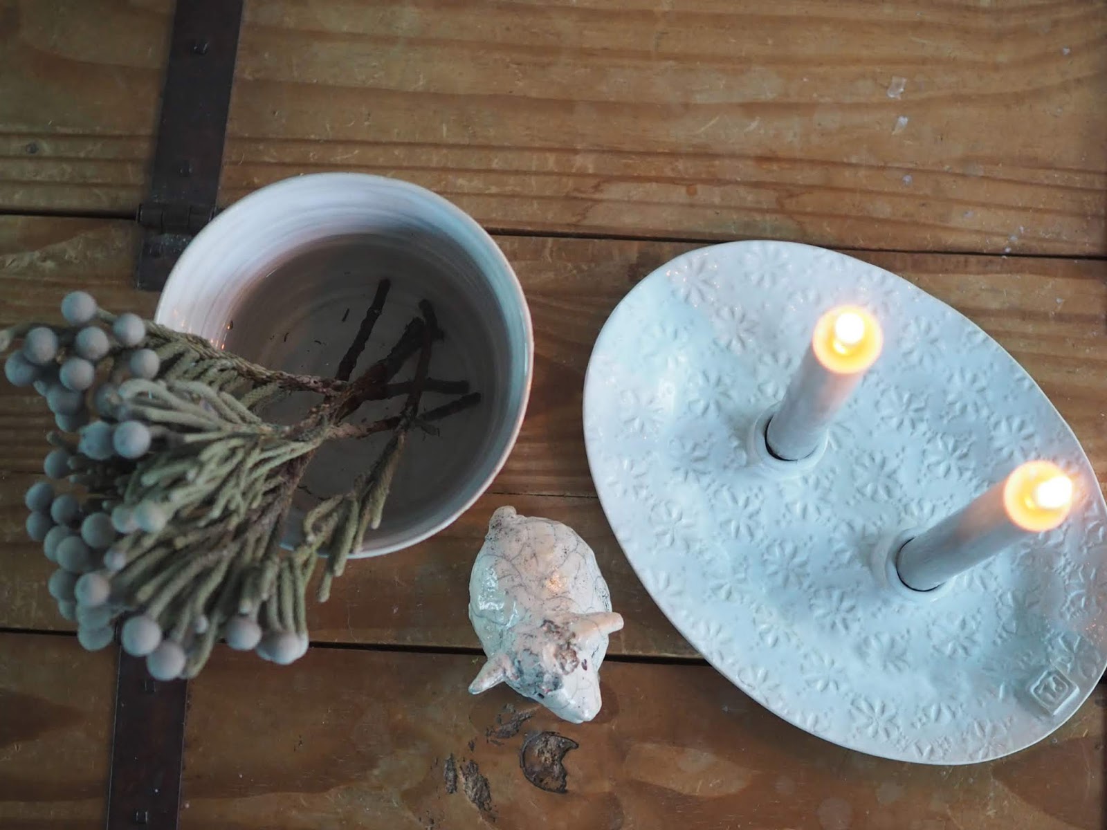 Muutakin olisin tuolta mielelleäni ostanut, mutta ihastuin eniten ruotsalaisen Petra Lundin kahden kynttilän kynttelikköön, ja sellainen lähtikin pienen mietinnän jälkeen mukaani. Sieluni silmin näin, että tästä tulisi hyvä yhdistelmä hiljattain Kätevä & Tekevä -messuillta ostamani Tuias -keramiikan kulhon/maljan kanssa. Niin kuin tulikin.:) Tuijan astioita multa löytyy muuten muitakin jo vuosien takaa ennestään. Ne ovat aivan ihania!<3 Kolmanneksi asetelmaan (jotta pariton määrä...) hain eteisen kaapista aikoinaan Suurhallin joulumarkkinoilta eräältä mummolta ostamani lampaan. Hän oli itse näitä savesta tehnyt, ehkäpä jollain Kansalaisopiston kurssilla.:) Oi, miten minuun nyt iskeekään keramiikka!<3